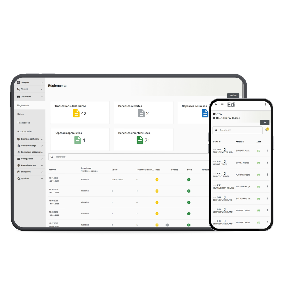 Son centre de cartes de crédit fait d'Edi une solution globale de gestion des cartes de crédit. La centralisation des informations en un même endroit facilite et optimise la gestion des cartes, des transactions et des factures.